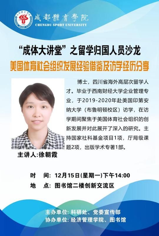 集团将于2025年12月15日(周一)下午14:00在图书馆2楼创新交流区举行“成体大讲堂”科研讲座系列活动之留学归国人员沙龙。本次讲座特邀伟德国际bevictor1946徐朝霞副教授主讲。题目为:《美国体育社会组织发展经验借鉴及访学经历分享》。欢迎全校师生积极参加。