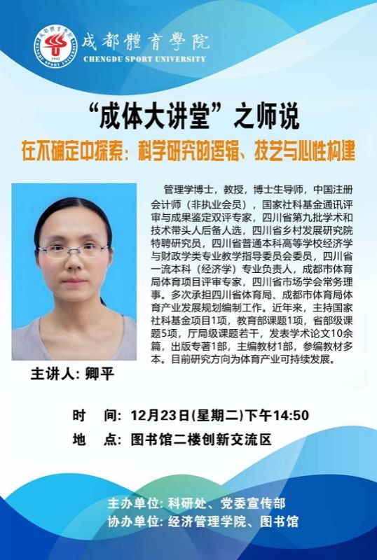 集团将于2025年12月23日(周二)下午14:50在图书馆2楼创新交流区举行“成体大讲堂”科研讲座系列活动之师说。本次讲座特邀伟德国际bevictor1946卿平教授主讲。题目为:《在不确定中探索:科学研究的逻辑、技艺与心性构建》。欢迎全校师生积极参加。