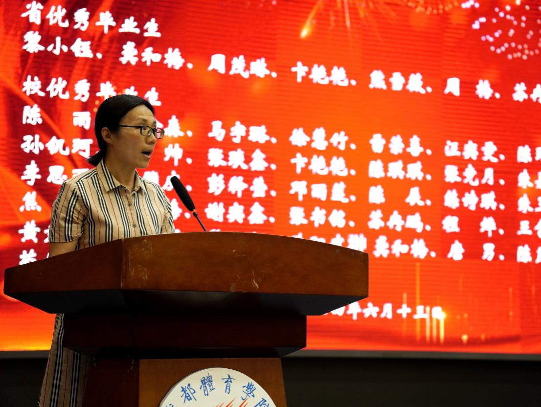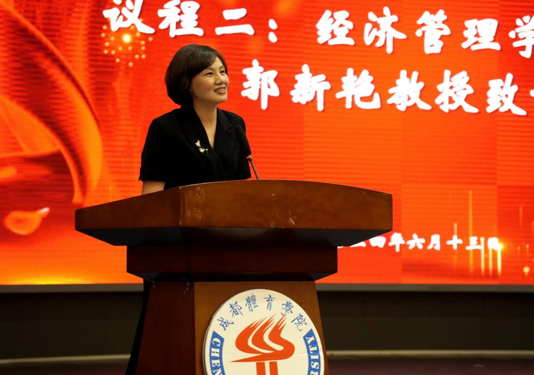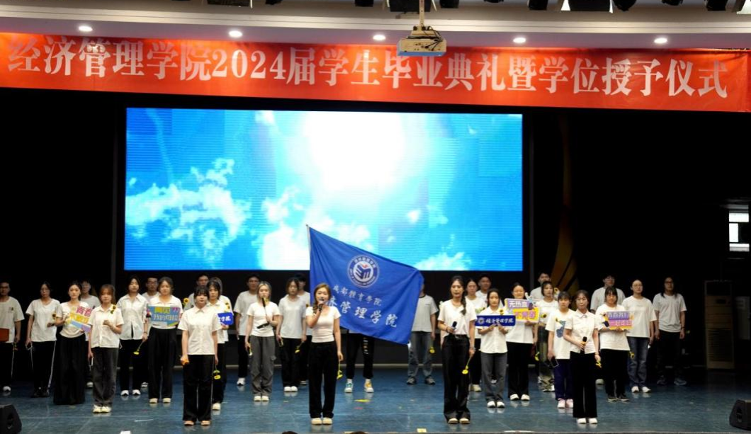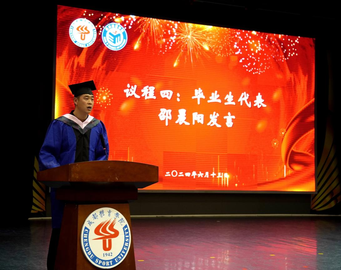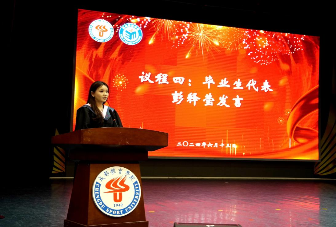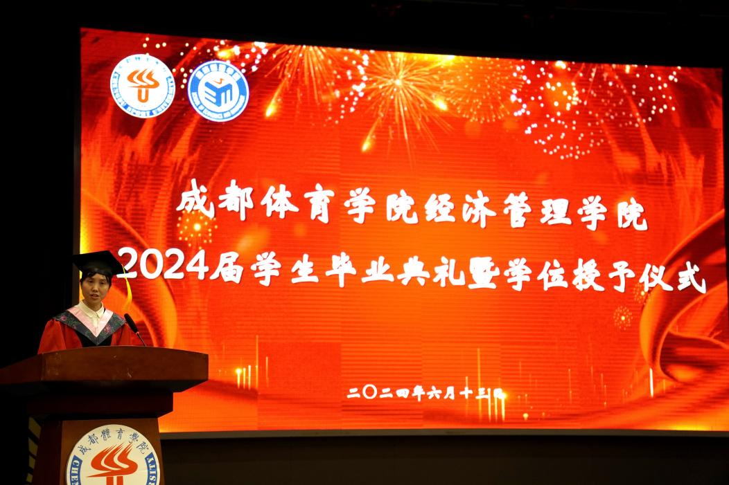 伴随着庄严的国歌声,毕业典礼正式开始。首先,郭新艳经理代表学院致辞,她向即将步入人生新阶段的2024届毕业生们表示了最衷心的祝福,总结了他们就读期间在学习、生活、社会实践、就业等各方面的优异表现。同时她也叮嘱毕业生始终保守初心,在矢志不渝中奋力向前;始终突出经管人的品格修炼,在复杂的环境中恪守正道,立志成为具有科学家精神和体育企业家精神的体育新质生产力创造者;“不驰于空想,不骛于虚声”,始终保持向上生长的方向,胸怀天下,用青春承载担当。