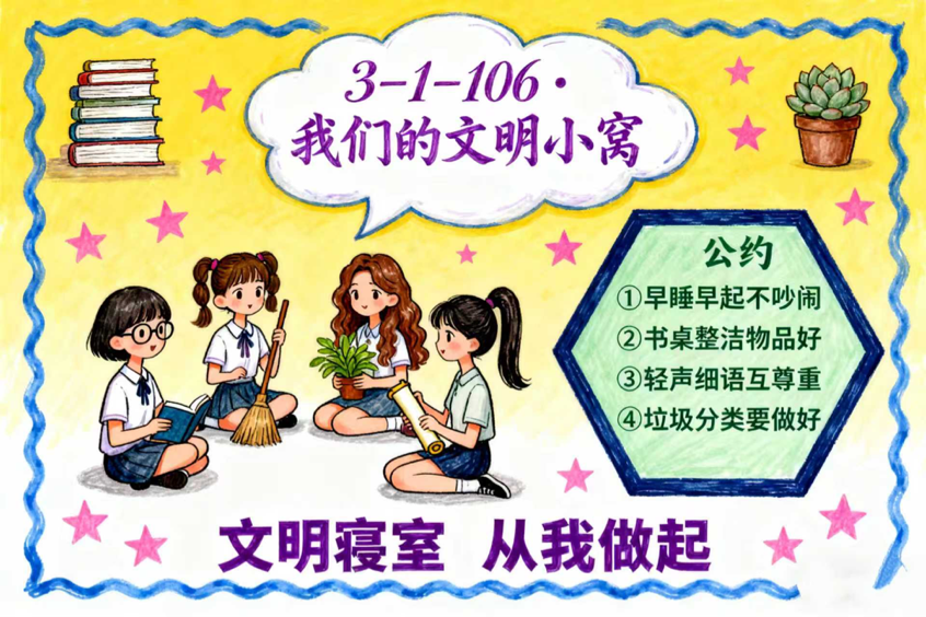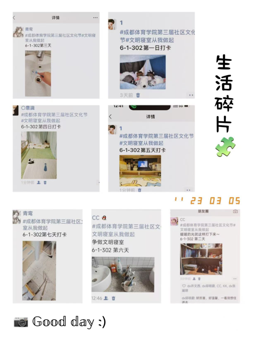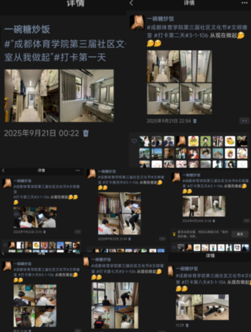 在为期一周的“美好生活日记”打卡环节中,各参赛寝室每日在朋友圈发布寝室生活照片,并配文指定话题,连续打卡7天,展现真实日常的寝室生活。同时,学校组织教师开展常态化卫生检查,重点核查日常整洁与保持情况,杜绝临时突击,确保评比公平有效。