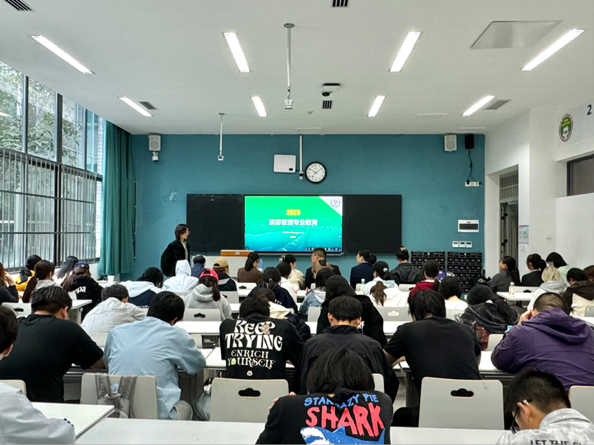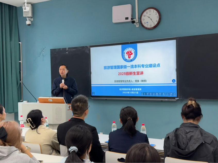 首先,杨强教授介绍了旅游管理专业的育人特色、课程体系与发展前景,重点剖析了专业未来的就业方向与核心竞争力。他勉励新同学们要锚定目标、潜心向学,充分利用学校提供的优质平台,不断提升专业素养与综合能力,为未来职业发展奠定坚实基础。