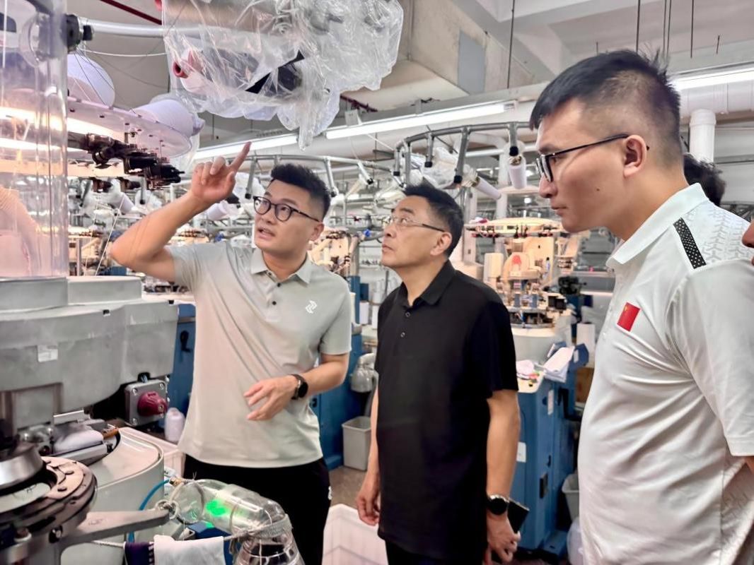 刘炜教授团队认为左右力量体育用品公司精准锚定市场需求,以科技为翼、以细节为基,构建了兼具安全性与功能性的产品体系,为中小体育用品企业的差异化发展树立了典范。在此后参观的运动袜生产车间中,调研团队现场观摩从纱线编织到质量检测的标准化流程,直观感受到体育用品制造业在材料工艺、生产控制和产品品质上的精细化水平。