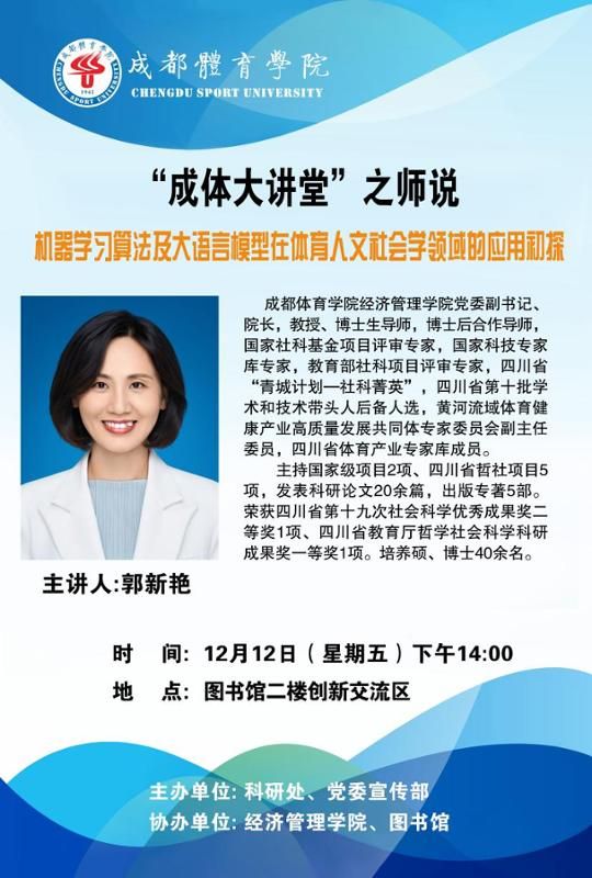 集团将于2025年12月12日(周五)下午14:00在图书馆2楼创新交流区举行“成体大讲堂”科研讲座系列活动之师说。本次讲座特邀伟德国际bevictor1946郭新艳教授主讲。题目为:《机器学习算法及大语言模型在体育人文社会学领域的应用初探》。欢迎全校师生积极参加。